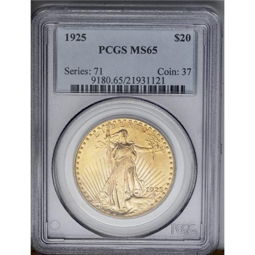 <B>1925<$20> MS65 PCGS.</B></I> A nicely struck example of this generally well produced issue. The lush orange-gold surfaces, tinged with green and hazel, sport flashy luster and reveal few mentionable abrasions, aside from a nick through Liberty's right (facing) leg at mid-calf.<BR><I>From The Jackson Hole Collection.</B></I>