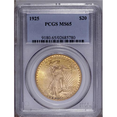 <B>1925 $20 MS65 PCGS.</B></I> Intense luster radiates from peach-gold surfaces that exhibit sharply brought-up devices. A few minute marks are within the parameters of the grade designation.