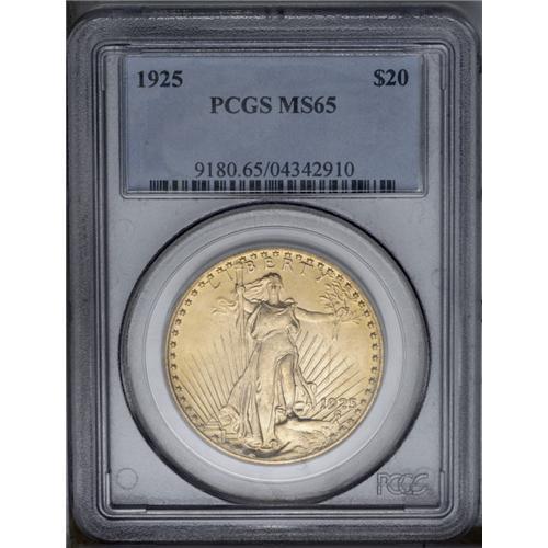 <B>1925 $20  MS65 PCGS.</B></I> The 1925 is a slightly scarcer issue among the common dates from the 1920s. This is an attractive example that displays soft, frosted mint luster and rich reddish-orange-gold coloration. Excellent surface preservation and superior eye appeal are the hallmarks of this lovely Gem.