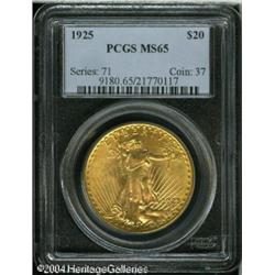1925 $20 MS65 PCGS. Well struck with full sparklin <B>1925 $20 MS65 PCGS.</B></I> Well struck with full sparkling luster, rich coloration, and a few small abrasions on the obverse. <BR><BR><B>Important notice:</B> Heritage usually auctions material at the rate of 200-250 lots per hour. On some occasions eBay Live bid software or the Internet may not be able to keep up with the pace of the auction. We recommend placing a realistic absentee bid now as insurance to avoid disappointment. Occasionally the auctioneer may eliminate or reject an eBay Live bid, and the auctioneer may also reopen a lot after the close of the eBay live bidding (usually because we missed an audience bid), and may reject your bid even if it shows you as the winning bidder. By bidding via eBay Live, you agree that Heritage may award the lot to another bidder at its sole discretion under the circumstances described above or any other reasonable circumstances. Since eBay bids are not shown to us until we open the lot on the floor, we treat those bids just like floor bids. In most cases the floor responds before the eBay bid is presented to us, due to Internet lag time, so for consistency we have made it a policy that floor bids are always considered first over tie eBay live bids. Also please note that all Heritage lots purchased through eBay Live carry a 20% Buyer's Premium. Please make sure you read the Terms and Conditions before you bid. This lot is being auctioned in conjunction with a live floor auction by Heritage Galleries & Auctioneers. All final auction and invoice information will be supplied by Heritage Galleries & Auctioneers, and all other information should be considered preliminary. Lot:7233
