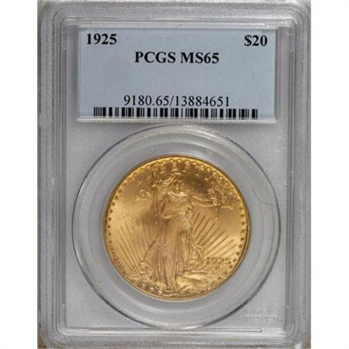 <B>1925 $20 MS65 PCGS.</B></I> An intriguing Gem, this piece has satiny pinkish-gold luster on the obverse and frosty greenish-gold luster on the reverse.<BR><BR><b>Shipping:</b> Coins & Currency (<a target="_blank" href="http://www.heritageauctions.com/common/shipping.php">view shipping information</a>)