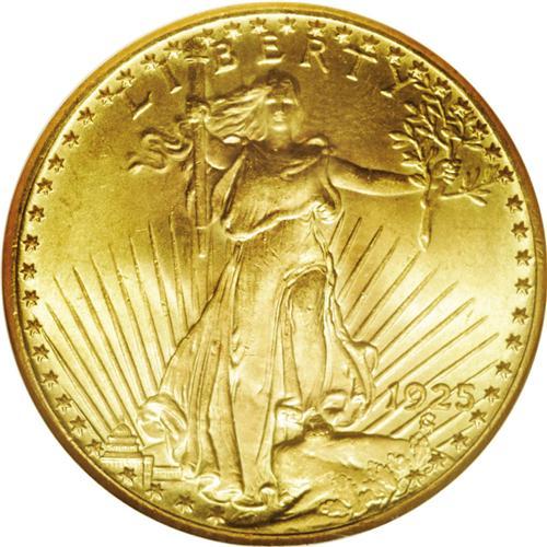 <B>1925<$20> MS66 NGC.</B></I> Dazzling, intensely lustrous surfaces are free from all but the most inconsequential blemishes. The total certified population of MS66 Saints is lower than one might expect, yet their current price level is most reasonable.