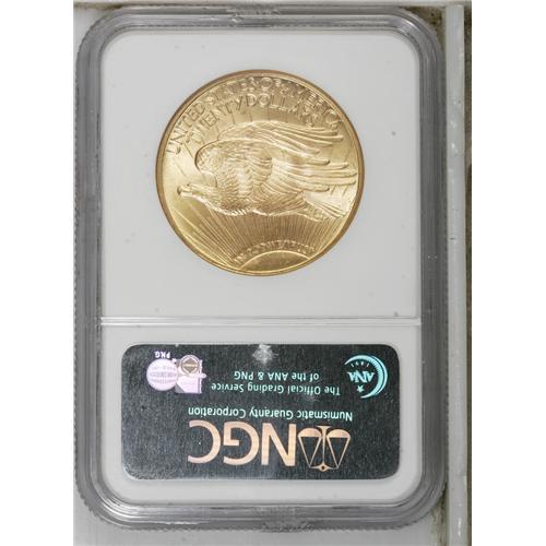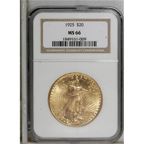 <B>1925 $20 MS66 NGC.</B></I> Mint State 1925 double eagles abound through MS65, where there is a sharp drop at the Premium Gem level, although even this grade is available with a little patience and searching. Bright luster adorns the brass-gold surfaces of this MS66 example, and a well executed strike emboldens the design elements. A few minor obverse marks may have precluded an even higher grade.<BR><BR><b>Shipping:</b> Coins & Currency (<a target="_blank" href="http://www.heritageauctions.com/common/shipping.php">view shipping information</a>)