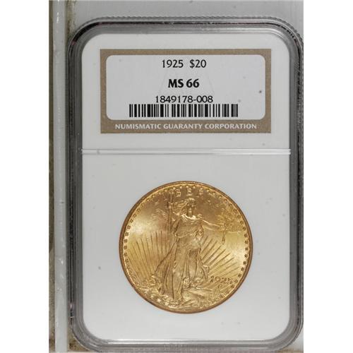 <B>1925 $20 MS66 NGC.</B></I> The 1925 double eagle is considered a common date, just like the previous issue, yet population figures only account for 15% of the 1924 total. This example is a wonderful orange-gold representative with satiny surfaces and sharp details.<BR><BR><b>Shipping:</b> Coins & Currency (<a target="_blank" href="http://www.heritageauctions.com/common/shipping.php">view shipping information</a>)