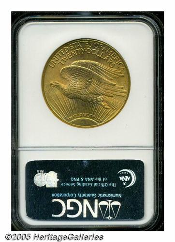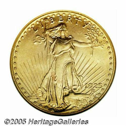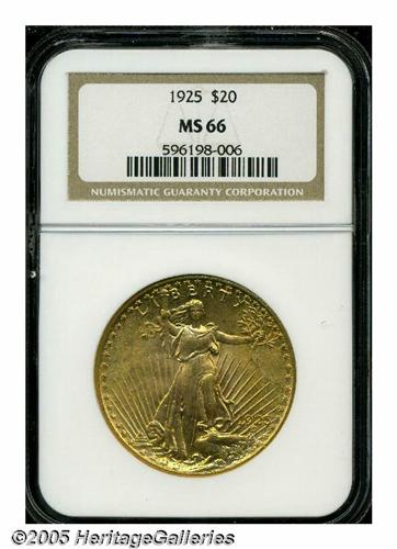<B>1925<$20> MS66 NGC.</B></I> The surfaces are notably free from abrasions and the coin has taken on a rich overlay of reddish-golden patina that is most attractive. A pleasing, high grade example of this popular date.