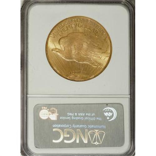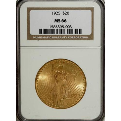 <B>1925 $20 MS66 NGC.</B></I> A delicate mix of green-gold and apricot adorns both sides of this Premium Gem. Devoid of mentionable marks, and sharply impressed on the design features.<BR><BR><B>Coin Engraver:</B> Augustus Saint-Gaudens<BR><BR><b>Shipping:</b> Coins & Currency (<a target="_blank" href="http://www.heritageauctions.com/common/shipping.php">view shipping information</a>\)