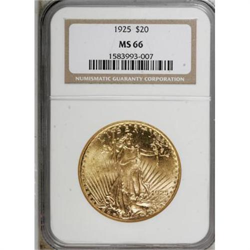 <B>1925 $20 MS66 NGC.</B></I> An exceptional example from both a technical and aesthetic standpoint. The fields are brilliant, demonstrating an exciting cartwheel effect upon rotation, and the surfaces are very clean. Some minor ticks are well-concealed within the eagle's feathers on the reverse. Rare any finer. Census: 401 in 66, 8 finer (12/07).<BR><BR><B>Coin Engraver:</B> Augustus Saint-Gaudens<BR><BR><b>Shipping:</b> Coins & Currency (<a target="_blank" href="http://www.heritageauctions.com/common/shipping.php">view shipping information</a>)