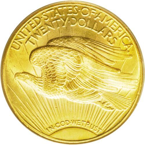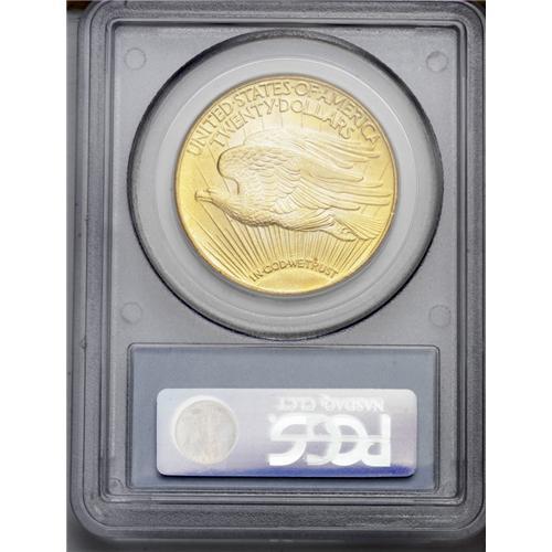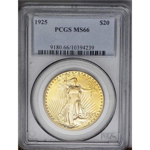<B>1925<$20> MS66 PCGS.</B></I> Although common in nearly all grades, the 1925 double eagle is essentially unobtainable any finer than MS66, as PCGS and NGC combined, have certified only 11 coins in higher grades. This lustrous example is notable for a lack of all but the tiniest surface abrasions, and is very well struck as are most high grade late-date Saints. Rich yellow-golden patina has accumulated on each side of this ultra frosty example. A highly desirable specimen.