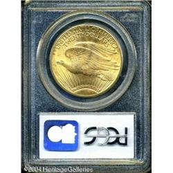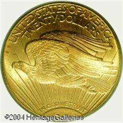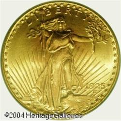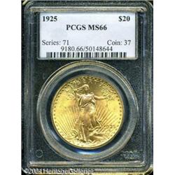 1925 $20 MS66 PCGS. Dazzling, intensely lustrous s <B>1925 $20 MS66 PCGS.</B></I> Dazzling, intensely lustrous surfaces are free from all but the most inconsequential blemishes. The total certified population of MS66 Saints is lower than one might expect, yet their current price level is most reasonable. <BR><BR><B>Important notice:</B> Heritage usually auctions material at the rate of 200-250 lots per hour. On some occasions eBay Live bid software or the Internet may not be able to keep up with the pace of the auction. We recommend placing a realistic absentee bid now as insurance to avoid disappointment. Occasionally the auctioneer may eliminate or reject an eBay Live bid, and the auctioneer may also reopen a lot after the close of the eBay live bidding (usually because we missed an audience bid), and may reject your bid even if it shows you as the winning bidder. By bidding via eBay Live, you agree that Heritage may award the lot to another bidder at its sole discretion under the circumstances described above or any other reasonable circumstances. Since eBay bids are not shown to us until we open the lot on the floor, we treat those bids just like floor bids. In most cases the floor responds before the eBay bid is presented to us, due to Internet lag time, so for consistency we have made it a policy that floor bids are always considered first over tie eBay live bids. Also please note that all Heritage lots purchased through eBay Live carry a 20% Buyer's Premium. Please make sure you read the Terms and Conditions before you bid. This lot is being auctioned in conjunction with a live floor auction by Heritage Galleries & Auctioneers. All final auction and invoice information will be supplied by Heritage Galleries & Auctioneers, and all other information should be considered preliminary. Lot:7235