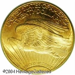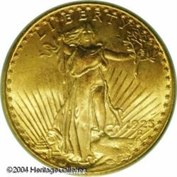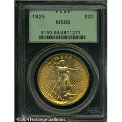 1925 $20 MS66 PCGS. One is immediately impressed b <B>1925 $20 MS66 PCGS.</B></I> One is immediately impressed by this Gem's liberal mint frost and splendid orange-golden color. One of the more common issues in the series at the Mint State level, but the supply of MS66s is somewhat limited. <BR><BR><B>Important notice:</B> Heritage usually auctions material at the rate of 200-250 lots per hour. On some occasions eBay Live bid software or the Internet may not be able to keep up with the pace of the auction. We recommend placing a realistic absentee bid now as insurance to avoid disappointment. Occasionally the auctioneer may eliminate or reject an eBay Live bid, and the auctioneer may also reopen a lot after the close of the eBay live bidding (usually because we missed an audience bid), and may reject your bid even if it shows you as the winning bidder. By bidding via eBay Live, you agree that Heritage may award the lot to another bidder at its sole discretion under the circumstances described above or any other reasonable circumstances. Since eBay bids are not shown to us until we open the lot on the floor, we treat those bids just like floor bids. In most cases the floor responds before the eBay bid is presented to us, due to Internet lag time, so for consistency we have made it a policy that floor bids are always considered first over tie eBay live bids. Also please note that all Heritage lots purchased through eBay Live carry a 20% Buyer's Premium. Please make sure you read the Terms and Conditions before you bid. This lot is being auctioned in conjunction with a live floor auction by Heritage Galleries & Auctioneers. All final auction and invoice information will be supplied by Heritage Galleries & Auctioneers, and all other information should be considered preliminary. Lot:7234