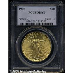 <B>1925<$20> MS66 PCGS.</B></I> One is immediately impressed by this Gem's liberal mint frost and splendid yellow-golden color. One of the more common issues in the series at the Mint State level, but the supply of MS66s is surprisingly limited. <BR><BR><B>Important notice:</B> Heritage usually auctions material at the rate of 200-250 lots per hour. On some occasions eBay Live bid software or the Internet may not be able to keep up with the pace of the auction. We recommend placing a realistic absentee bid now as insurance to avoid disappointment. Occasionally the auctioneer may eliminate or reject an eBay Live bid, and the auctioneer may also reopen a lot after the close of the eBay live bidding (usually because we missed an audience bid), and may reject your bid even if it shows you as the winning bidder. By bidding via eBay Live, you agree that Heritage may award the lot to another bidder at its sole discretion under the circumstances described above or any other reasonable circumstances. Since eBay bids are not shown to us until we open the lot on the floor, we treat those bids just like floor bids. In most cases the floor responds before the eBay bid is presented to us, due to Internet lag time, so for consistency we have made it a policy that floor bids are always considered first over tie eBay live bids. Also please note that all Heritage lots purchased through eBay Live carry a 20% Buyer's Premium. Please make sure you read the Terms and Conditions before you bid. </span></font></tr></table></td></tr></table>