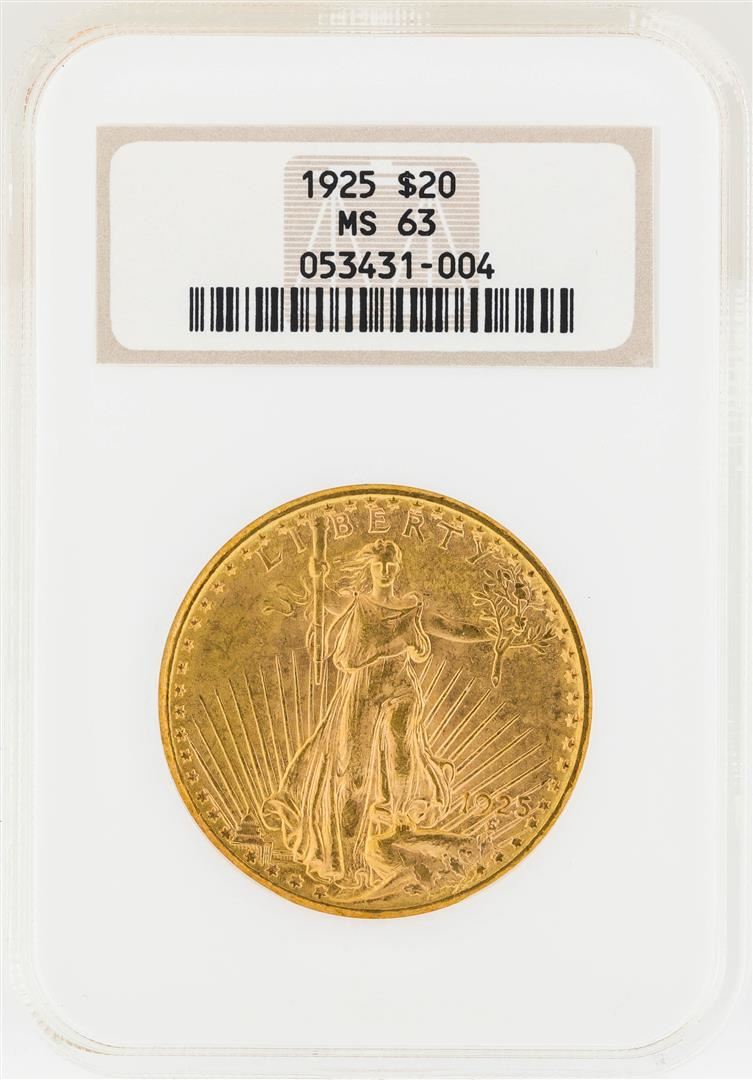 One 1925 $20 St. Gaudens Double Eagle Gold Coin NGC MS63. NGC Certified.