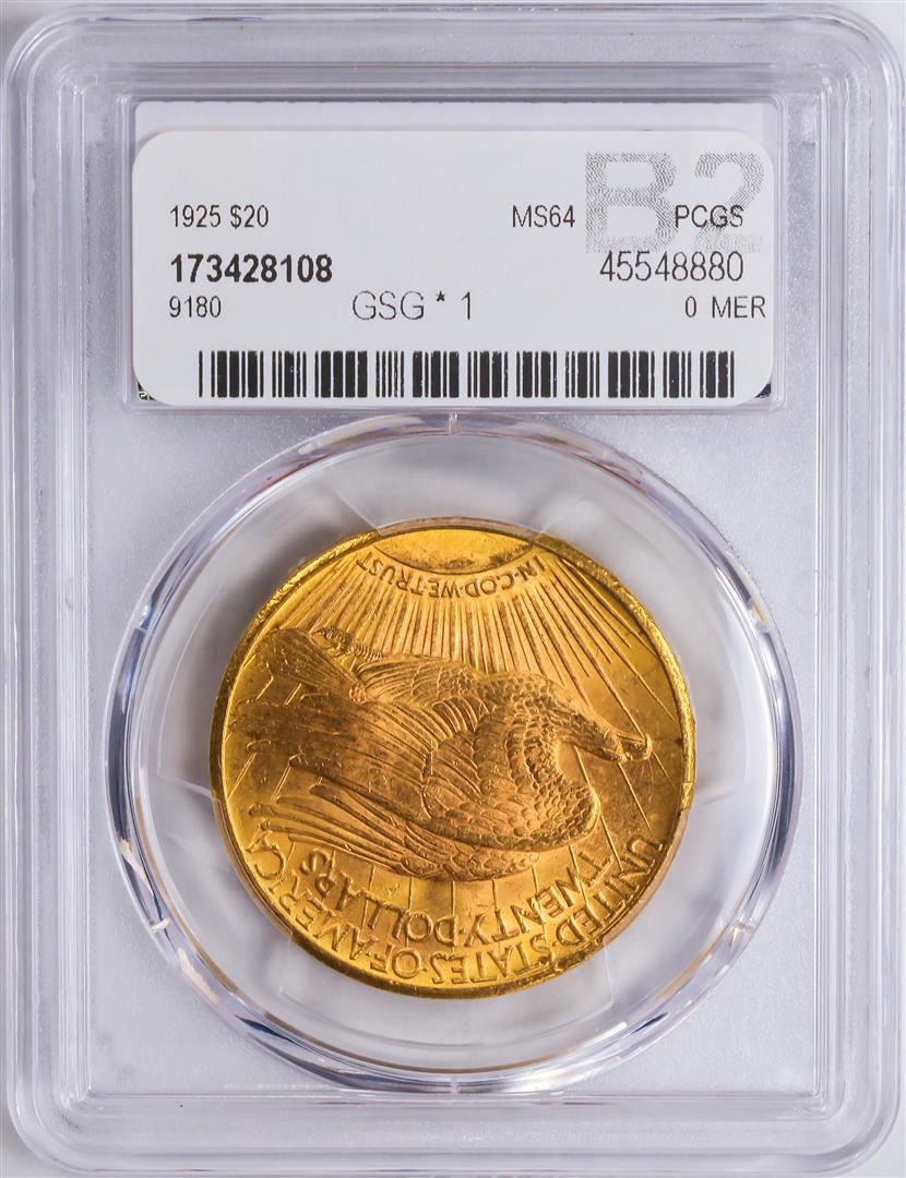 One 1925 $20 St. Gaudens Double Eagle Gold Coin PCGS MS64.