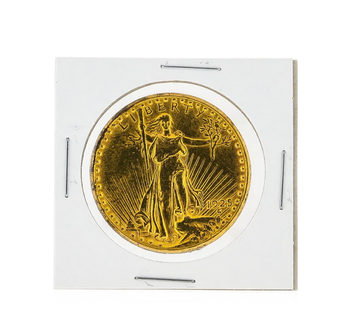 One 1925 $20 St. Gaudens Double Eagle Gold Coin.