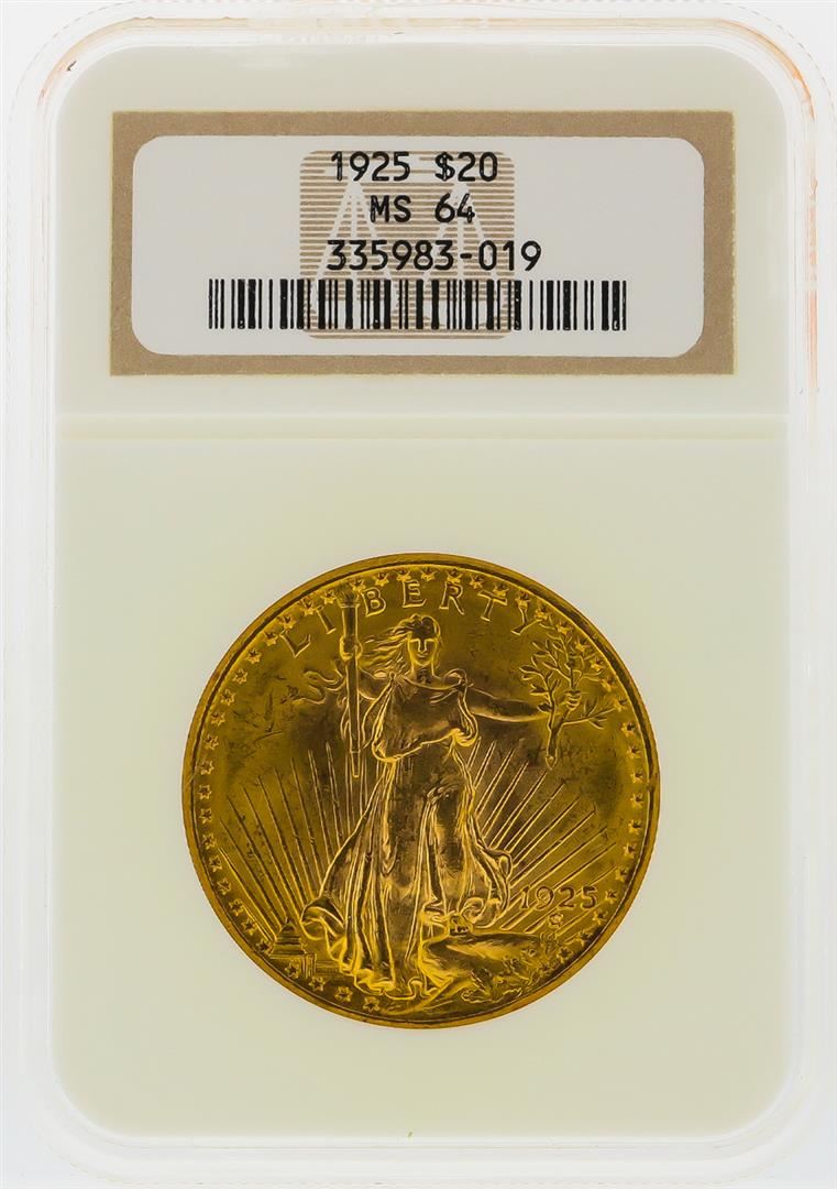 One 1925 $20 St. Gaudens Gold Double Eagle Coin NGC MS64. NGC Certified.