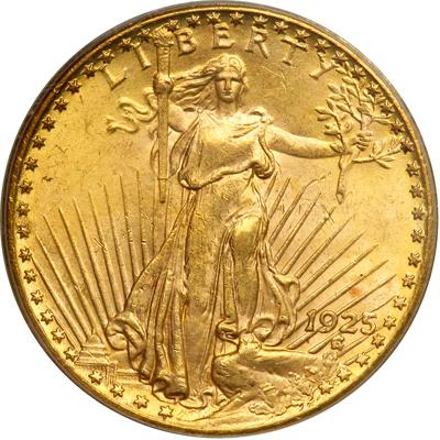 1925 $20 St. Gaudens. PCGS graded MS-63. Excellent sharpness on all devices. Choice with frosty luster (PCGS # 9180).