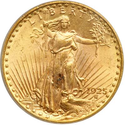 1925 $20 St. Gaudens. PCGS graded MS-63. We note an obverse copper spot on Liberty's knee. Lustrous and bold (PCGS # 9180) .