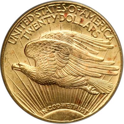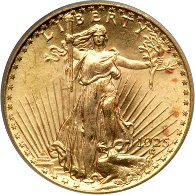 1925 $20 St. Gaudens. PCGS graded MS-64. Some copper spots on both sides but otherwise very frosty and choice. Untoned (PCGS # 9180).
