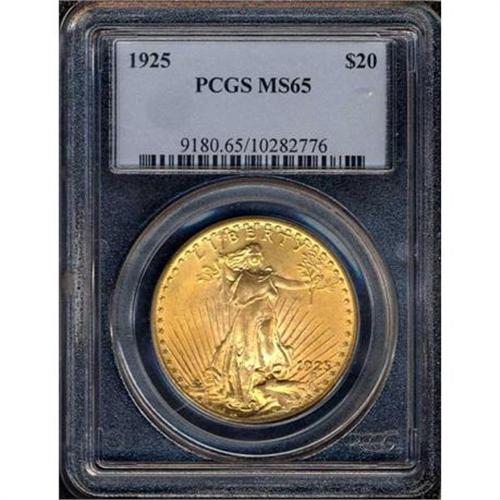 <b>1925 $20 St. Gaudens. PCGS graded MS65.</b> This example is quite pleasing with good luster and splashes of almost peach-orange patina on each side. No deviation in the sharp relief seen, either, not even in the centers of the coin <b>(PCGS # 9180)</b> <i>