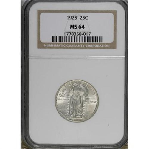 <B>1925 25C MS64 NGC.</B></I> . NGC Census: (146/80). PCGS Population (234/111). Mintage: 12,280,000. Numismedia Wsl. Price for NGC/PCGS coin in MS64: $280. (#5752)<BR><BR><B>Coin Engraver:</B> Hermon A. MacNeil<BR><BR><b>Shipping:</b> Coins & Currency (<a target="_blank" href="http://www.heritageauctions.com/common/shipping.php">view shipping information</a>)