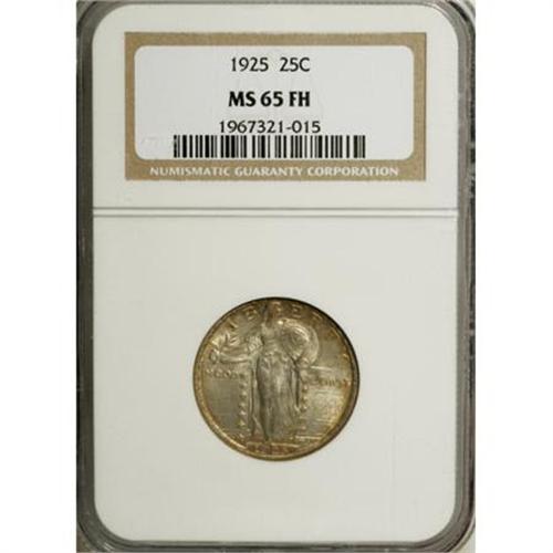 <B>1925 25C MS65 Full Head NGC.</B></I> Light to medium intensity violet, gray, red-gold, and yellow-gold patina resides on the highly lustrous surfaces of this well struck Gem. Completeness on the chain mail complements the Full Head. Nicely preserved on both sides.<BR><BR><B>Coin Engraver:</B> Hermon A. MacNeil<BR><BR><b>Shipping:</b> Coins & Currency (<a target="_blank" href="http://www.heritageauctions.com/common/shipping.php">view shipping information</a>)