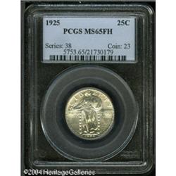1925 25C MS65 Full Head PCGS. Bright white surface <B>1925 25C MS65 Full Head PCGS.</B></I> Bright white surfaces display scintillating luster, and the motifs are sharply impressed. A few minute marks on Liberty's midsection and the adjacent left part of the shield are noted for accuracy. Population: 102 in 65, 45 finer (10/04). <BR><BR><B>Important notice:</B> Heritage usually auctions material at the rate of 200-250 lots per hour. On some occasions eBay Live bid software or the Internet may not be able to keep up with the pace of the auction. We recommend placing a realistic absentee bid now as insurance to avoid disappointment. Occasionally the auctioneer may eliminate or reject an eBay Live bid, and the auctioneer may also reopen a lot after the close of the eBay live bidding (usually because we missed an audience bid), and may reject your bid even if it shows you as the winning bidder. By bidding via eBay Live, you agree that Heritage may award the lot to another bidder at its sole discretion under the circumstances described above or any other reasonable circumstances. Since eBay bids are not shown to us until we open the lot on the floor, we treat those bids just like floor bids. In most cases the floor responds before the eBay bid is presented to us, due to Internet lag time, so for consistency we have made it a policy that floor bids are always considered first over tie eBay live bids. Also please note that all Heritage lots purchased through eBay Live carry a 20% Buyer's Premium. Please make sure you read the Terms and Conditions before you bid. This lot is being auctioned in conjunction with a live floor auction by Heritage Galleries & Auctioneers. All final auction and invoice information will be supplied by Heritage Galleries & Auctioneers, and all other information should be considered preliminary. Lot:5961