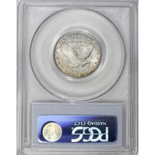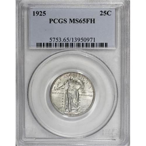 <B>1925 25C MS65 Full Head PCGS.</B></I> Dappled yellow-tan and peach patina is noted on the reverse. The obverse is essentially untoned, except for a few dark-russet specks near the upper right border. Bright and satiny, the surfaces are well preserved and free of distractions. Always popular as the first year of the Type Three, with a recessed date. <BR><BR><B>Coin Engraver:</B> Hermon A. MacNeil<BR><BR><b>Shipping:</b> Coins & Currency (<a target="_blank" href="http://www.heritageauctions.com/common/shipping.php">view shipping information</a>)