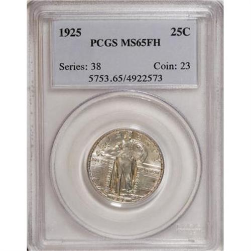<B>1925 25C MS65 Full Head PCGS.</B></I> This is an essentially untoned Gem, save for some flecks of russet and pale gold color, with gleaming mint luster over both sides. The design elements are sharply struck and minimal surface marks are noted only on the reverse.<BR><BR><B>Coin Engraver:</B> Hermon A. MacNeil<BR><BR><b>Shipping:</b> Coins & Currency (<a target="_blank" href="http://www.heritageauctions.com/common/shipping.php">view shipping information</a>)