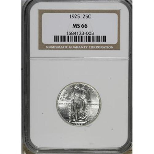 <B>1925 25C MS66 NGC.</B></I> NGC Census: (7/1). PCGS Population (12/1). Mintage: 12,280,000. Numismedia Wsl. Price for NGC/PCGS coin in MS66: $785. (#5752)<BR><BR><B>Coin Engraver:</B> Hermon A. MacNeil<BR><BR><b>Shipping:</b> Coins & Currency (<a target="_blank" href="http://www.heritageauctions.com/common/shipping.php">view shipping information</a>)
