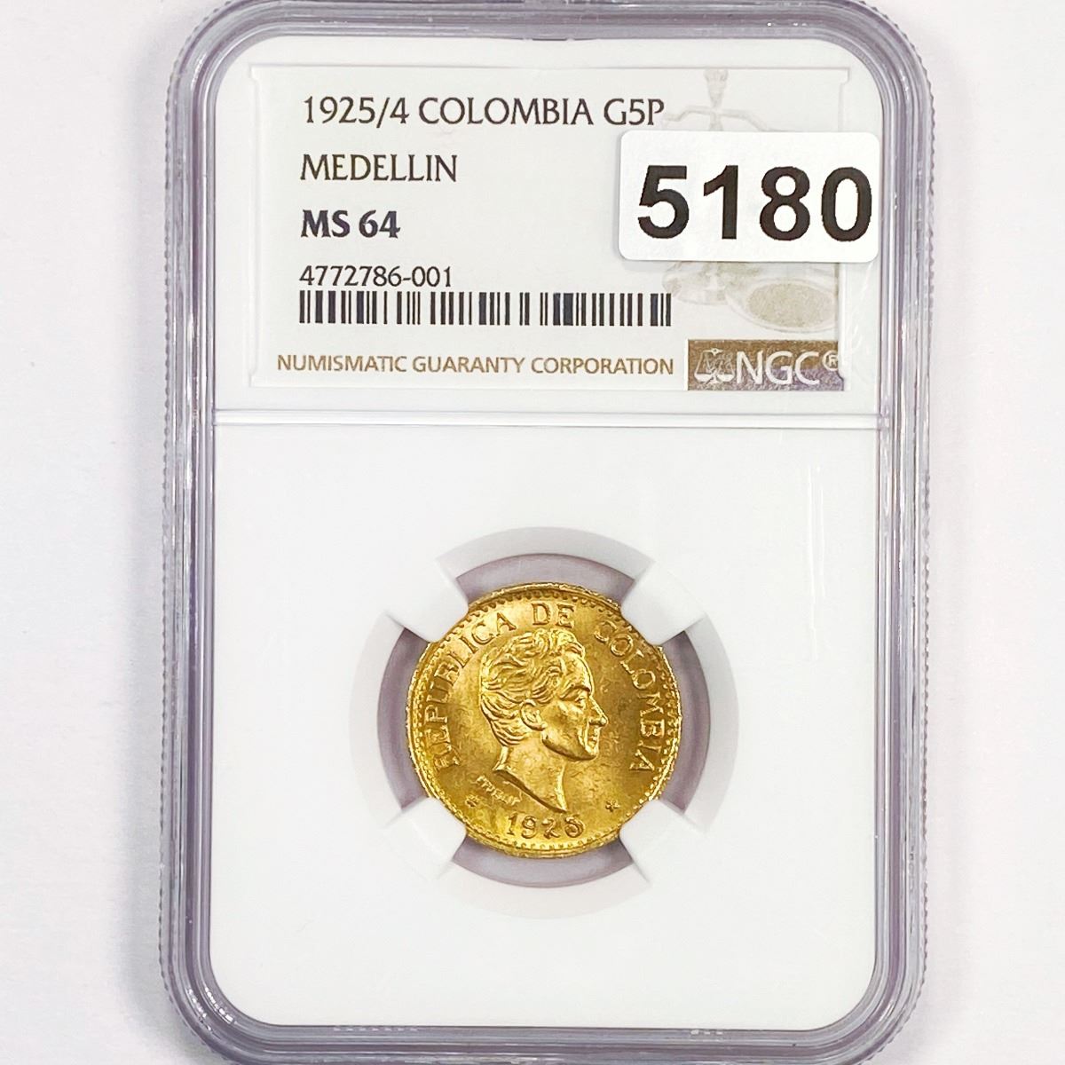 1925/4 Gold (.916 2/3)Colombian 5 Pesos NGC -