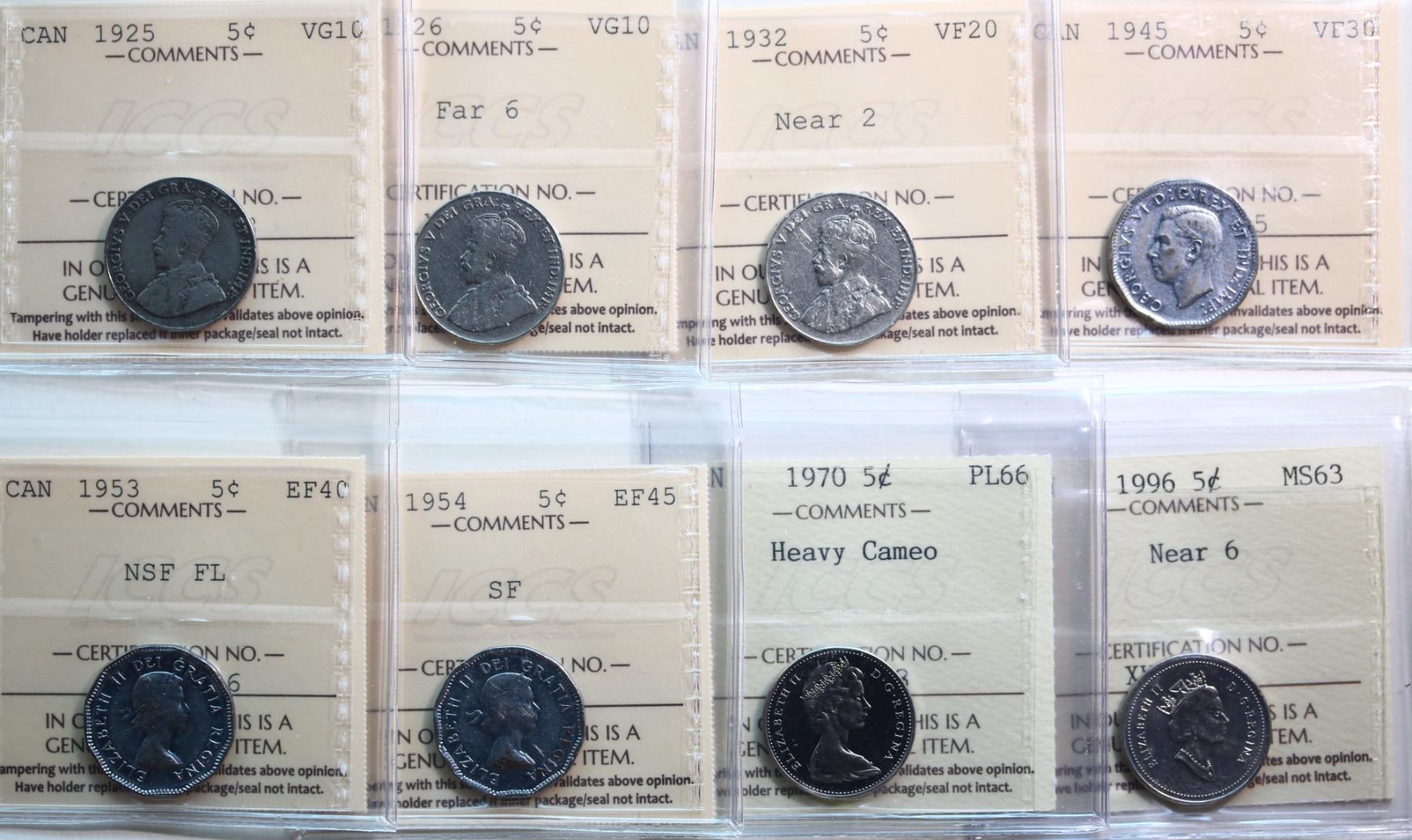 1925 5¢, 1926, 1932, 1945, 1953, 1954, 1970, 1996. Lot of 8 coins all ICCS Very Good-10 to Superb Ge