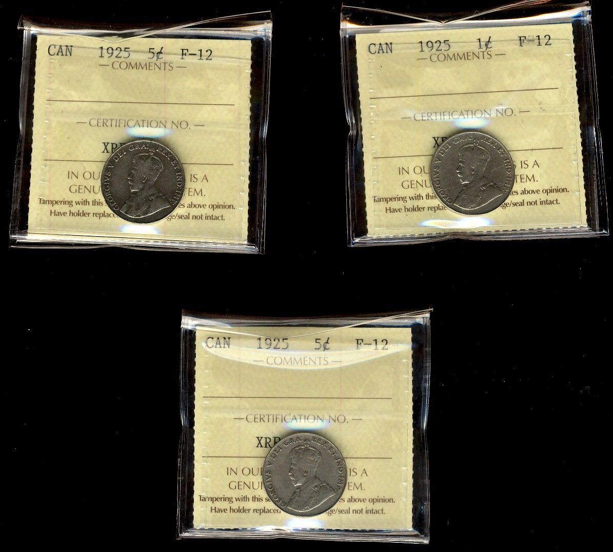 1925 5¢ ICCS F12. Lot of 3 coins.