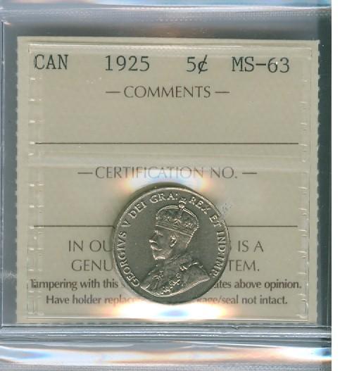 1925 5¢ ICCS MS63. Key date example with full lustre and all beads visible.