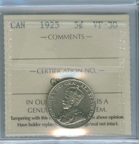 1925 5¢ ICCS VF30. A nice problem free coin with light lustre.