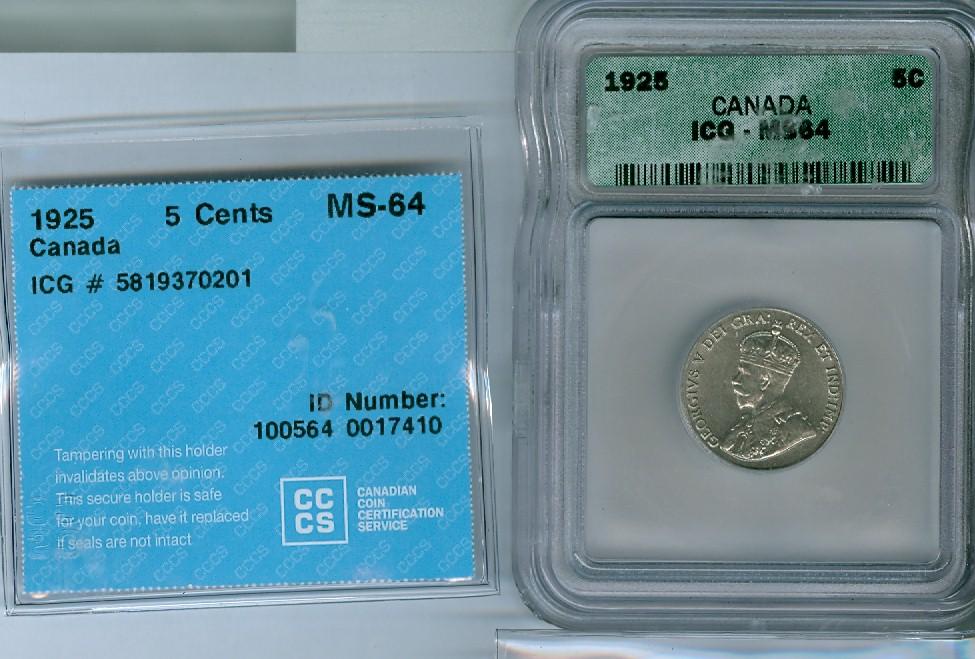 1925 5¢ ICG/CCCS cross graded MS64, fully brilliant and lust
