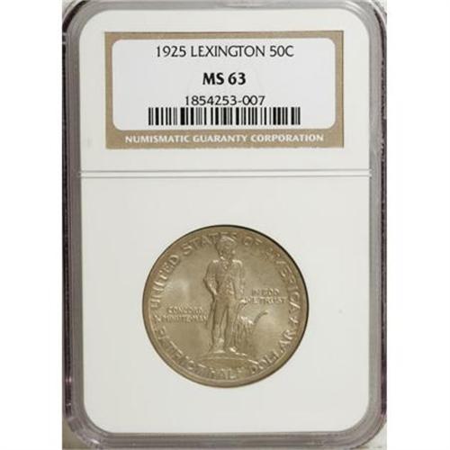 <B>1925 50C Lexington MS63 NGC.</B></I> NGC Census: (564/2493). PCGS Population (1038/2619). Mintage: 162,013. Numismedia Wsl. Price for NGC/PCGS coin in MS63: $100. (#9318)<BR><I>From The Frank DuVall Collection of U.S. Commemoratives.</B></I><BR><BR><b>Shipping:</b> Coins & Currency (<a target="_blank" href="http://www.heritageauctions.com/common/shipping.php">view shipping information</a>\)