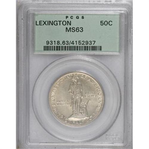 <B>1925 50C Lexington MS63 PCGS.</B></I> PCGS Population (1045/2664). NGC Census: (571/2513). Mintage: 162,013. Numismedia Wsl. Price for NGC/PCGS coin in MS63: $100. (#9318)<BR><BR><b>Shipping:</b> Coins & Currency (<a target="_blank" href="http://www.heritageauctions.com/common/shipping.php">view shipping information</a>)