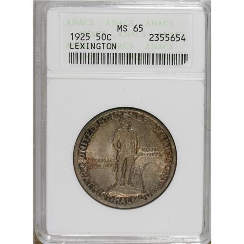 <B>1925 50C Lexington MS65 ANACS.</B></I> NGC Census: (1508/272). PCGS Population (801/246). Mintage: 162,013. Numismedia Wsl. Price for NGC/PCGS coin in MS65: $510. (#9318)<BR><BR><b>Shipping:</b> Coins & Currency (<a target="_blank" href="http://www.heritageauctions.com/common/shipping.php">view shipping information</a>)