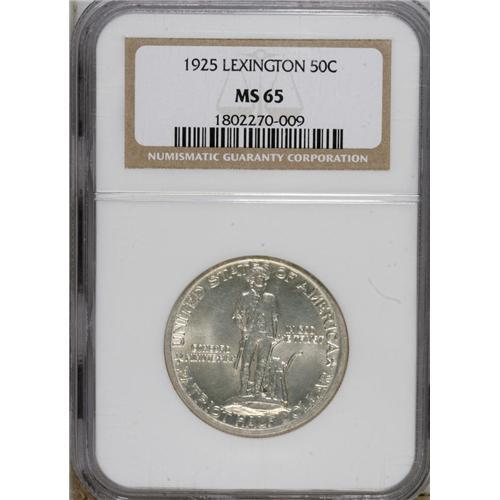 <B>1925 50C Lexington MS65 NGC.</B></I> Light tawny-gold toning visits this satiny and intricately struck Gem. Clean fields confirm the high grade of this Revolutionary War commemorative.<BR><BR><b>Shipping:</b> Coins & Currency (<a target="_blank" href="http://www.heritageauctions.com/common/shipping.php">view shipping information</a>)