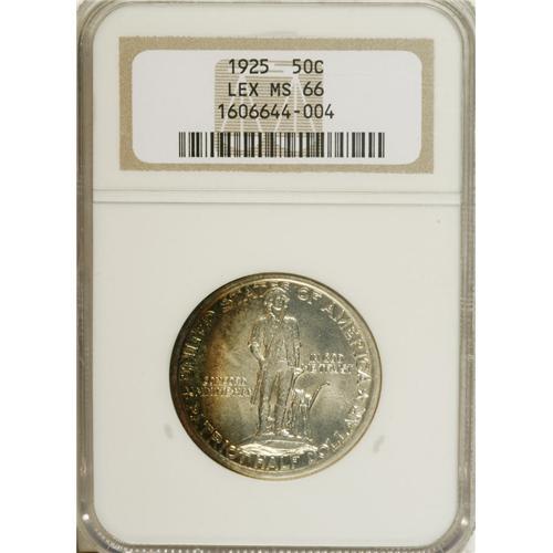 <B>1925 50C Lexington MS66 NGC.</B></I> Both sides exhibit considerable brilliance, though the left obverse displays bands of gold, blue-green, and orange. Similar color grazes the left reverse, while approaching neither the statue nor the Old Belfry. Two small marks are noted in the left obverse field. NGC has graded just nine Superb Gems (4/07).<BR><I>From The Cary & Cheryl Porter Collection.</B></I><BR><BR><b>Shipping:</b> Coins & Currency (<a target="_blank" href="http://www.heritageauctions.com/common/shipping.php">view shipping information</a>)