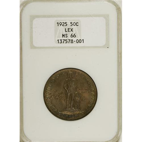 <B>1925 50C Lexington MS66 NGC.</B></I> Softly lustrous beneath rich violet, rose, and greenish-gold patina. This crisply struck example is housed in an early holder. NGC has graded only nine coins finer (1/07).<BR><BR><b>Shipping:</b> Coins & Currency (<a target="_blank" href="http://www.heritageauctions.com/common/shipping.php">view shipping information</a>)