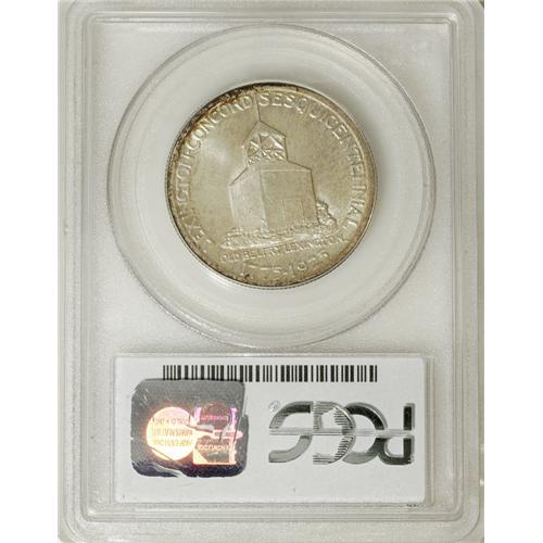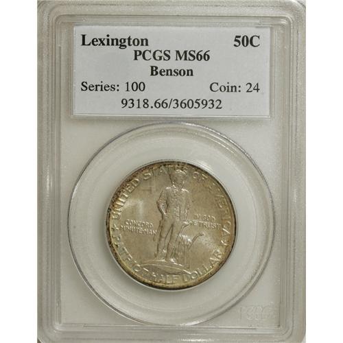 <B>1925 50C Lexington MS66 PCGS.</B></I> Ex: Benson. Delicate blue-gray patina graces the lustrous centers, while the rims have lime-green toning and speckled violet color. The devices exhibit pleasing definition overall on this first Revolutionary War commemorative. PCGS has graded only nine coins finer (4/07).<BR><BR><b>Shipping:</b> Coins & Currency (<a target="_blank" href="http://www.heritageauctions.com/common/shipping.php">view shipping information</a>)