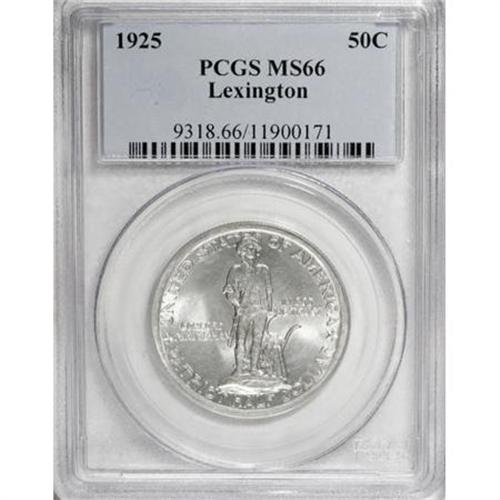 <B>1925 50C Lexington MS66 PCGS.</B></I> Boldly impressed and essentially brilliant with vibrant luster. The Lexington half is highly elusive any finer, with only nine such pieces certified by PCGS (2/08).<BR><BR><b>Shipping:</b> Coins & Currency (<a target="_blank" href="http://www.heritageauctions.com/common/shipping.php">view shipping information</a>)