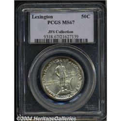 <B>1925<50C> Lexington MS67 PCGS.</B></I> Well struck with exceedingly bright, semi-reflective surfaces that are attractively toned near the peripheries and only display a few minor grazes in the fields. A conditionally rare item, with only one example known in any finer grade, at PCGS. Population: 5 in 67, 1 finer (3/04).<BR><I>From the JFS Collection, the #1 All-Time PCGS Registry Set.</B></I> <BR><BR><B>Important notice:</B> Heritage usually auctions material at the rate of 200-250 lots per hour. On some occasions eBay Live bid software or the Internet may not be able to keep up with the pace of the auction. We recommend placing a realistic absentee bid now as insurance to avoid disappointment. Occasionally the auctioneer may eliminate or reject an eBay Live bid, and the auctioneer may also reopen a lot after the close of the eBay live bidding (usually because we missed an audience bid), and may reject your bid even if it shows you as the winning bidder. By bidding via eBay Live, you agree that Heritage may award the lot to another bidder at its sole discretion under the circumstances described above or any other reasonable circumstances. Since eBay bids are not shown to us until we open the lot on the floor, we treat those bids just like floor bids. In most cases the floor responds before the eBay bid is presented to us, due to Internet lag time, so for consistency we have made it a policy that floor bids are always considered first over tie eBay live bids. Also please note that all Heritage lots purchased through eBay Live carry a 20% Buyer's Premium. Please make sure you read the Terms and Conditions before you bid. </span></font></tr></table></td></tr></table>