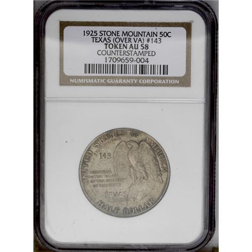 <B>1925<50C> Stone Mountain--Counterstamped--AU58 NGC.</B></I> TEXAS/VA 143. It is uncommon for a state to be entered without an abbreviation in this series, and in this example it was likely done to reuse the A in VA (Virginia), with the V partly obscured by the X in TEXAS. Other counterstamps are known with TEXAS over FLA. A satiny olive-brown piece with slight wear on the eagle's breast, the horse's hip, and the general's leg. Copies of correspondence to and from Stone Mountain counterstamp authority Adna Wilde, Jr. accompany the lot.