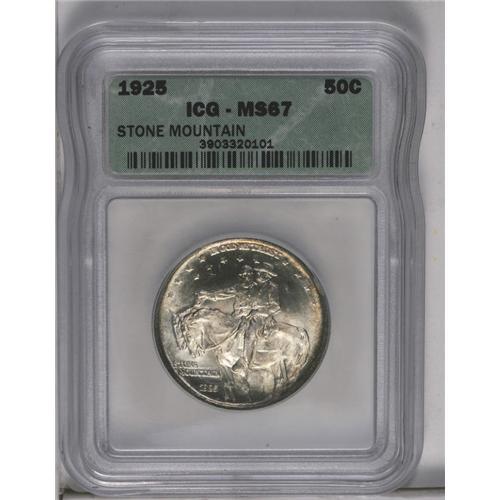 <B>1925<50C> Stone Mountain MS 67 ICG.</B></I> One of the most popular and easily obtainable issues in the lower grades of Uncirculated, the Stone Mountain is an appealing and much needed coin for commemorative collectors in Superb condition. The mint luster is impeccable and mostly brilliant with just a little bit of light golden peripheral toning present.