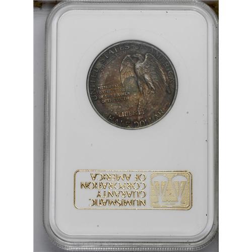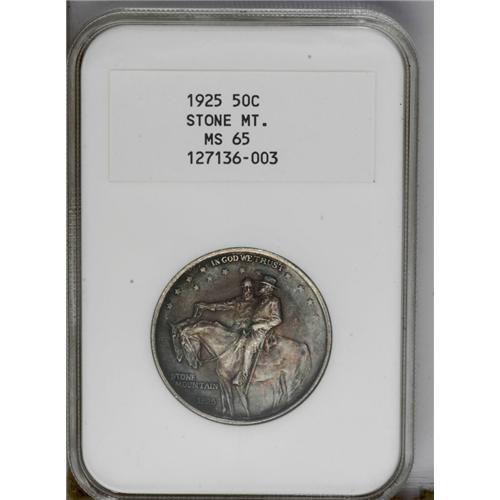 <B>1925<50C> Stone Mountain MS65 NGC.</B></I> Cartwheel luster readily penetrates the deep ruby-red and forest-green patination. Housed in an early generation, pre-hologram NGC holder. A magnificent example of this popular Southern pride issue.