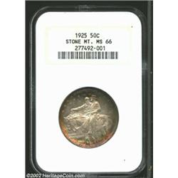 1925 50C Stone Mountain MS66 NGC. The devices of Southern influence are framed by gentle original toning. Gold, gray, russet, and hints of blue formed in a process that only time can perfect. Important notice: We expect to be auctioning lots at the rate of 200-250 per hour. Sometimes eBay Premier live bid software cannot keep up with that pace, so we strongly recommend that you place a realistic proxy bid now as insurance to avoid disappointment. Also please note that all Heritage/CAA lots purchased through eBay Premier carry a 20% Buyer's Premium. Please make sure you read the Terms and Conditions.