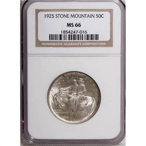 <B>1925 50C Stone Mountain MS66 NGC.</B></I> SOLDIER and SOUTH are die doubled. NGC Census: (566/131). PCGS Population (666/169). Mintage: 1,314,709. Numismedia Wsl. Price for NGC/PCGS coin in MS66: $440. (#9378)<BR><I>From The Frank DuVall Collection of U.S. Commemoratives.</B></I><BR><BR><b>Shipping:</b> Coins & Currency (<a target="_blank" href="http://www.heritageauctions.com/common/shipping.php">view shipping information</a>)