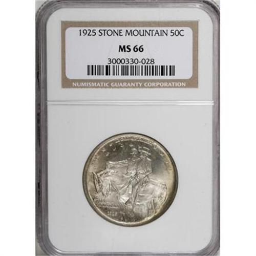 <B>1925 50C Stone Mountain MS66 NGC.</B></I> NGC Census: (569/132). PCGS Population (686/169). Mintage: 1,314,709. Numismedia Wsl. Price for NGC/PCGS coin in MS66: $440. (#9378)<BR><BR><b>Shipping:</b> Coins & Currency (<a target="_blank" href="http://www.heritageauctions.com/common/shipping.php">view shipping information</a>)